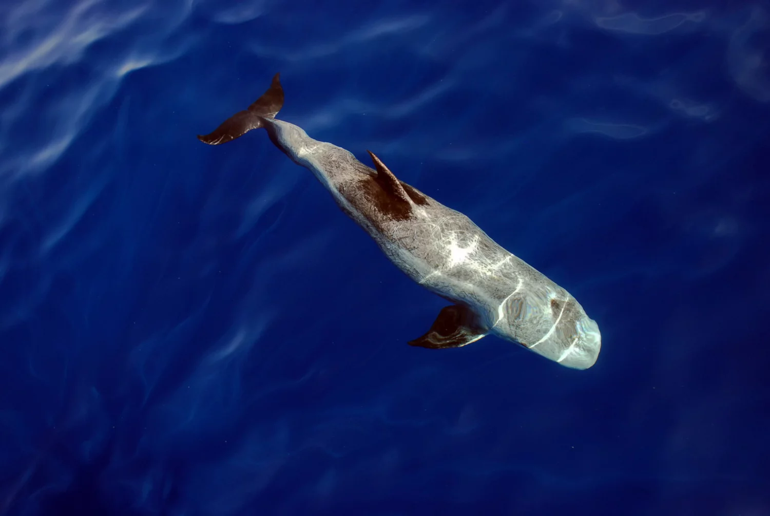 - Come altri delfinidi, a volte emergono dall’acqua (spy-hopping), rivelando l’intera testa e il corpo fino alla pinna per 3 secondi o più, come se osservassero l’ambiente circostante. Comportamento tipico della specie ma ancora poco conosciuto è mantenere la coda fuori dall’acqua in verticale per diversi secondi, fino a quasi un minuto, ondeggiandola.